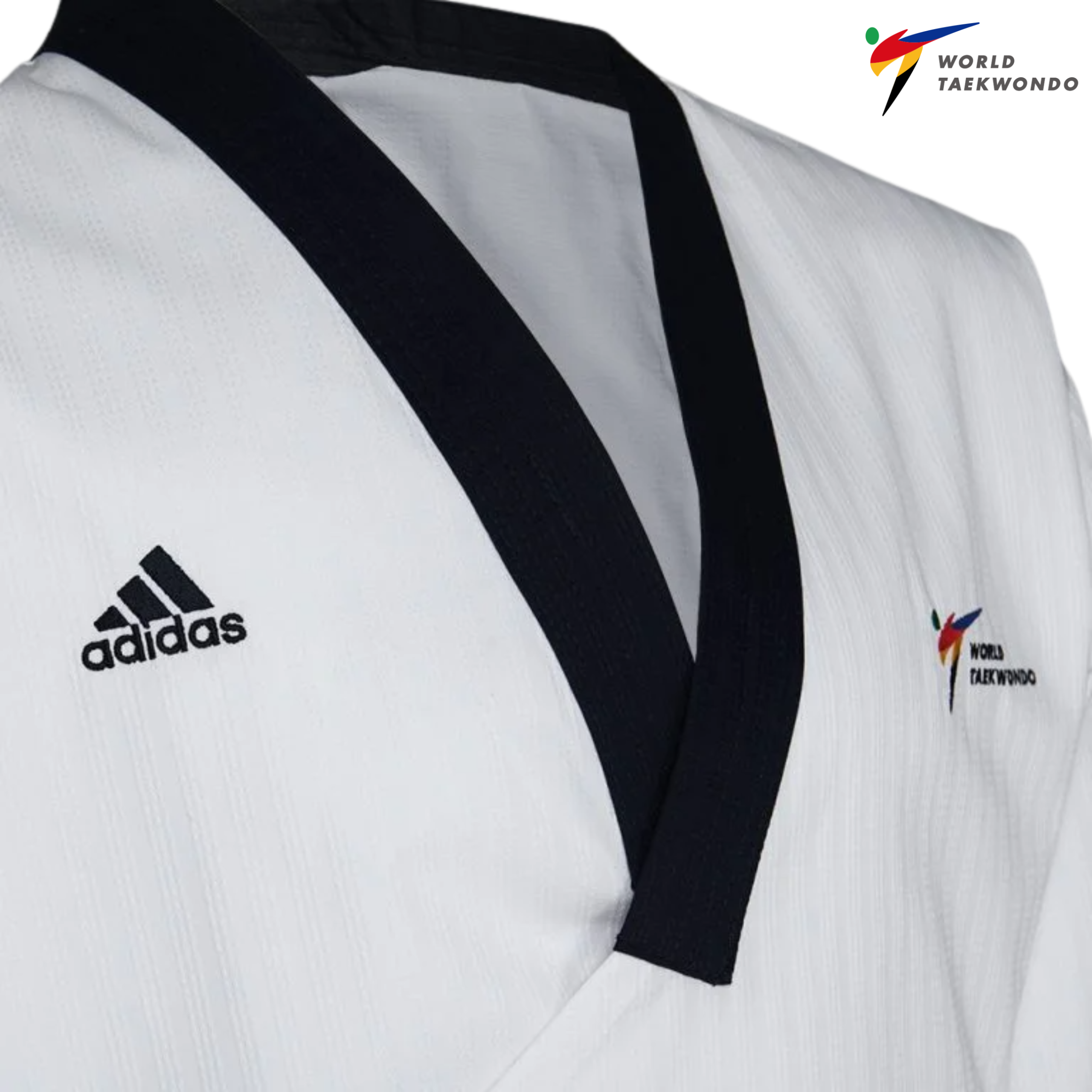 Pakaian Seragam Taekwondo Adidas ADI-Poomsae Adult Male diperbuat daripada campuran 55% kapas, 45% poliester untuk ketahanan dan keselesaan. Direka mengikut peraturan rasmi WT, ia menampilkan pakaian seragam leher V hitam dengan bukaan hadapan. Seluar dilengkapi pinggang elastik dan tali serut tambahan untuk kesesuaian yang ketat. Fabrik berstruktur meningkatkan prestasi teknikal, dengan logo sulaman Adidas dan WT menambah sentuhan premium.